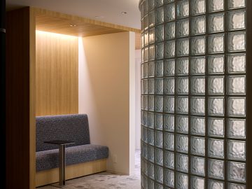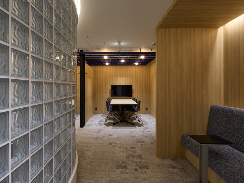 In particular, the corner walls of the meeting rooms are composed of translucent glass blocks, providing a balance between privacy and openness both inside and outside the rooms.