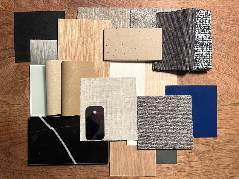 The primary finishes include light-toned oak wood and ivory-colored wall coverings.