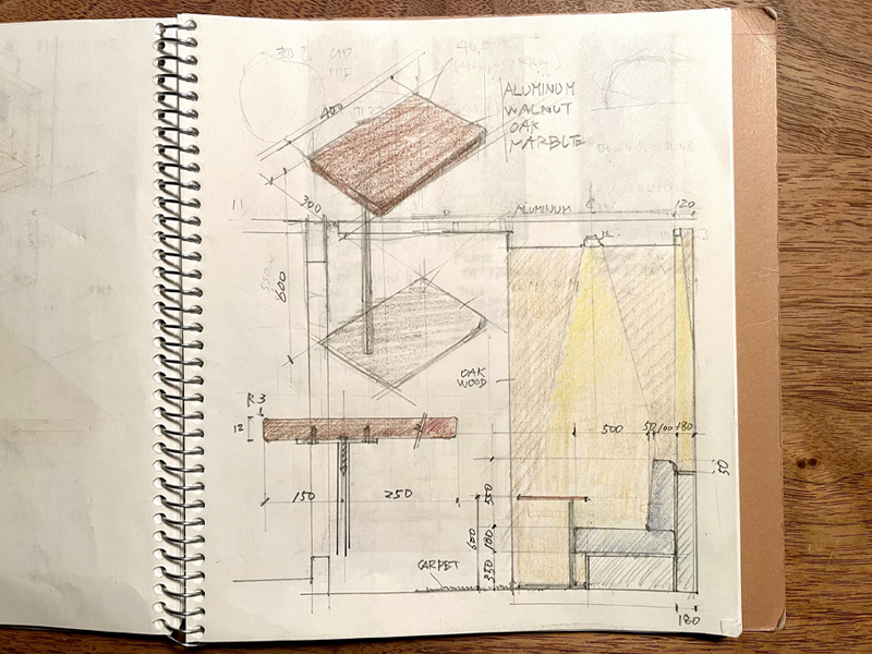 韓国のアルミニウム家具ブランド RKRN との協働により本プロジェクトのために特注制作し、ソファに座ったままの簡単な筆記やモバイルワークにも対応するコンパクトなサイズとした。